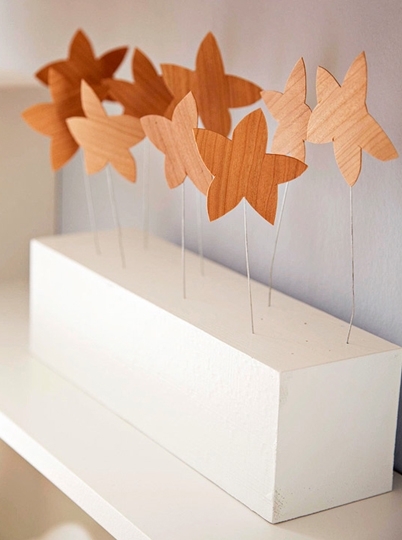 ไม้เลื้อย ของตกแต่งชิ้นนี้ให้อารมณ์ที่สนุกสนานสดใส ด้วยเพราะรูปทรงคล้ายกับกิ่วก้านสาขาของต้นไม้เลยค่ะ เลือกไม้วีเนียร์ที่บางและแข็งแรงพอจะดัดได้ มาตัดให้เป็นแถบที่มีความกว้าง 4 นิ้ว และนำมายึดเข้ากับผนังด้วยตัวยึดพลาสติก คุณสามารถทำออกมาได้หลายๆชิ้นและติดผนังหลายๆทิศทางตามต้องการ แท่งไม้เอนกประสงค์ อีกไอเดียในการรับสร้างบ้านจัดระเบียบใบเสร็จ ใบปลิว ตั๋วหรือบัตรต่างๆ แทนที่เราจะเอามากองไว้เฉยๆก็นำมาเสียบไว้กับแท่งไม้นี้ได้ โดยวิธีการก็แสนจะง่าย ตัดไม้ออกเป็นแผ่นๆ จำนวน 6 แผ่นคล้ายกับทำกล่อง แล้วนำมาประกอบเข้าด้วยกัน เลือกใช้ยางรัดหรือริบบิ้นยืดสีที่คุณชอบ มาเป็นตัวรัดรอบแท่งไม้สำหรับเสียบบัตรเหล่านี้ละค่ะ หากใครมีกล่องสินค้าที่ไม่ใช้แล้ว จะนำมาห่อด้วยกระดาษลายไม้ก็ไม่ว่ากันค่ะ ก่อนจะห่ออย่าลืมถ่วงก้อนหินหรือของหนักๆ ไว้ภายในด้วย แท่งไม้จะได้ตั้งตรงไม่ล้มหรือร่วงหล่นได้ง่ายค่ะ แพทเทิร์นไม้ลายผนัง อีกลูกเล่นหนึ่งที่นิชมใช้ในงานไม้ คือการต่อไม้เป็นแพทเทิร์นที่สลับทิศทางของแนวไม้อย่างมีศิลป์ วิธีทำก็แสนง่าย โดยการสร้างกรอบสี่เหลี่ยมขนาดต่างๆ กันเรียงเป็นลวดลายกราฟฟิกโดยใช้แท่งไม้ขนาดเล็ก (ขนาดหน้าตัดไม่เกิน 2 นิ้ว) และตัดวีเนียร์สำหรับแต่ละช่องให้มีขนาดพอดีกับกรอบช่อง อย่าลืมเลือกใช้วีเนียร์ที่มีลวดลายไม้ชัดเจน และจัดแนวของลายไม้สลับทิศทางต่างๆด้วยนะคะ เท่านี้ผนังเก่าๆ เรียบๆ ก็จะดูมีคุณค่าขึ้นมาทันทีเลยค่ะ
